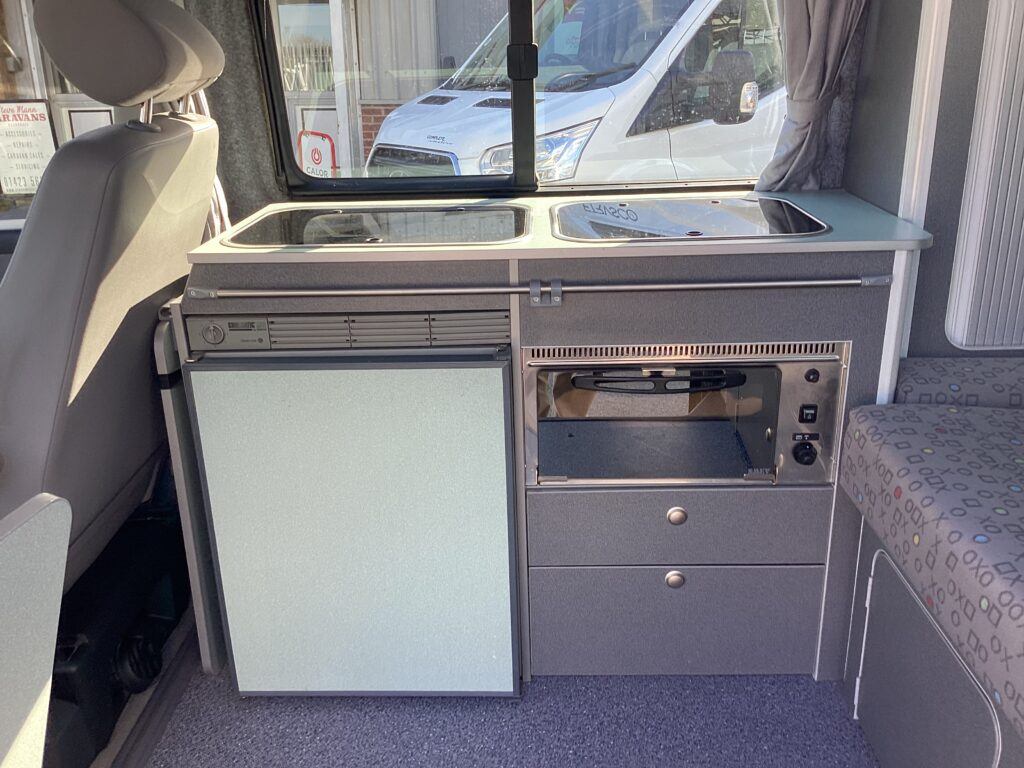 The kitchen area boasts large compression fridge with freezer compartment, 2 burner hob, grill and sink unit as well as ample storage including high level.