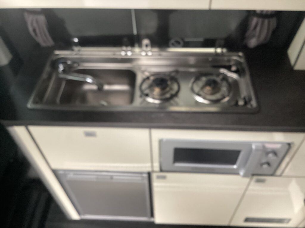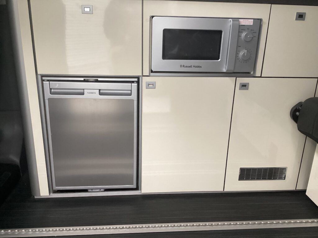 The kitchen unit has a compression fridge, 2 burner hob, sink unit with onboard water tank and microwave. It also boasts ample storage cupboards including high level.